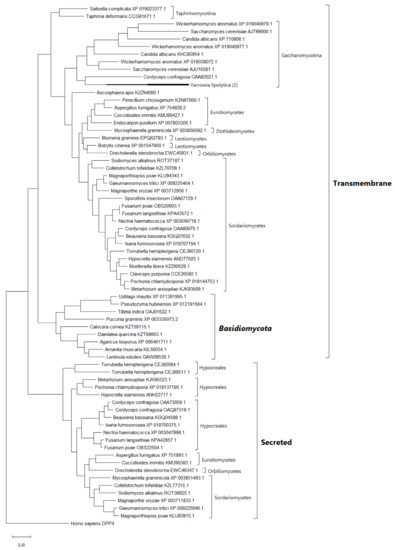 To assess the evolutionary relationship of DPP4, we reconstructed a phylogenetic tree of its homologs (Figure 2). In this tree two distinct groups of homologs differing in the presence of a signal peptide can be distinguished. Secreted forms are found exclusively in the Pezizomycotina subdivision in the Ascomycota division, while transmembrane forms are found in all six subdivisions of higher fungi. Transmembrane homologs, in turn, are grouped according to the taxonomic position of objects into clades corresponding to the divisions Basidiomycota and Ascomycota, and further into subdivisions within these clades. Thus, the duplication of the DPP4 gene may have occurred in the early evolution of the Pezizomycotina group, resulting in subsequent diversification of paralogs into transmembrane and secreted forms. Furthermore, this phylogenetic tree explains why FAP homologs are absent in the analyzed fungal genomes. Based on the available data, the DPP4 and FAP enzyme evolutionary lines might have parted after the separation of the fungal and animal evolutionary lines, which is manifested in the close clustering of the human and bovine FAP orthologs, as well as the human and porcine DPP4 orthologs. Thus, fungal homologs of DPP4 can be considered as homologs of the common ancestral enzyme for FAP and DPP4.