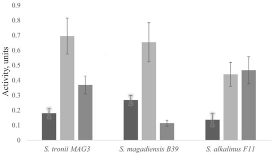 Identification and study of the secreted PSPs were performed on five species of alkaliphilic and alkali-tolerant mycelial dikaryomycetes from the family Plectosphaerellaceae (Glomerellales; Sordariomycetes) and one alkali-tolerant species from the family Hypocreaceae (Hypocreales; Sordariomycetes). The data obtained showed that DPP4 is the most represented extracellular PSP. Studying the physiology and biochemistry of alkaliphilic and alkali-tolerant fungi is interesting as, on the one hand, it can facilitate the understanding of the mechanisms underlying the adaptation of these organisms to extreme environments and lead to the discovery of new and practically significant enzymes or secondary metabolites. On the other hand, it is crucial to develop measures to prevent biological damage to products by these fungi at alkaline pH. Secretion of PSPs depended on the content of the nutrient medium. Thus, when three species of alkaliphilic fungi of the genus Sodiomyces were grown on three alkaline fermentation media (malt, peptone, casein as nitrogen sources), DPP4 was secreted in all the studied media, but different protein sources stimulated the secretion of the general activity DPP4 to a different degree (Figure 3). When the mycelium of the studied strains was grown on malt extract, it gained mass relatively quickly, but produced a relatively small amount of DPP4. At the same time, when it was grown on a medium with peptone as a nitrogen source, S. alkalinus F11, S. tronii MAG3, and S. magadiensis B39 showed the highest DPP4 activity in terms of dry mycelium mass. The selection of cultivation period for the S. alkalinus F11 strain, which was the most effective producer of PSP from the set of selected cultures, showed that the most intensive growth was recorded on 5–18 days, after which the curve of the dry mycelium mass began to reach a plateau. In the lag phase, the studied strain secreted only trace the amounts of PSP, and the most active production of peptidase occurred at the end of the logarithmic growth stage. DPP4 activity increased by day 14 of cultivation from 0 to 7 units/mg of dry mycelium, then gradually decreased to 5 units/mg of dry mycelium by day 24 of growth. DPP4 in all studied alkali-tolerants and in all alkaliphiles, respectively, had a similar pattern of changes in biochemical properties. All the observed differences were related only to the amount of secreted activity. Among the studied alkali-tolerant species, the highest DPP4 activity was found in Chordomyces antarcticus M27, which, along with S. alkalinus F11, an effective enzyme producer per dry mycelium among alkaliphiles, was used in further work. Notably, in alkaliphilic representatives of the family (strains of the genus Sodiomyces), high DPP4 activity was found not only outside the cells, but also in the cell extract; in alkali-tolerants, no noticeable accumulation of DPP4 in cells was observed.
