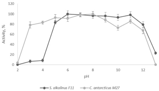 To survive in conditions of extremely high pH, living organisms have special enzymes that are not highly active at an alkaline pH, but rather alkali-resistant. Measuring the DPP4 activity of F11 and M27 strains after prolonged incubation in a universal buffer of different acidity showed that both enzymes retained hydrolytic activity in a wide pH range. Thus, DPP4 of S. alkalinus F11 was stable in the pH range of 5.0–12.0 and retained 23% of its activity after an hour of incubation at pH 13.0. DPP4 of the alkali-tolerant strain M27, in turn, showed a significantly greater relative activity after incubation in an acidic environment (78% vs. 7% after incubation at pH 3.0), but completely denatured at pH 13.0 (Figure 5). Since the studied DPP4 homologs are secreted enzymes, these differences may indicate that S. alkalinus F11 adapted to constant alkaline environment, and C. antarcticum M27 adapted to a wide range of pH, with an optimum at a neutral pH.