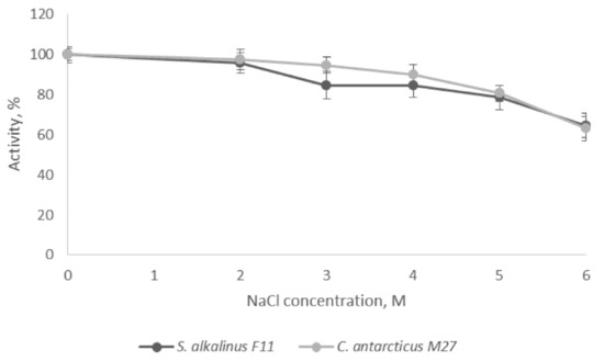 Analysis of the salt resistance of the studied PSP revealed that the activity of extracellular DPP4 strains F11 and M27 in 6 M NaCl solution at optimal pH values was 64% and 63% of the maximum, respectively (Figure 6). Retention of most enzyme activity at extremely high salt concentrations reflects the conditions of natural habitats where these fungi thrive. Thus, determining the stability of DPP4 in excess of NaCl showed that the studied peptidase is a halostable enzyme and retains activity in NaCl solutions close to the saturated one.