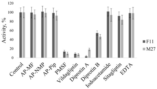 To characterize the biochemical properties of the studied DPP4, an enzyme inhibitor analysis was performed using specific peptidase inhibitors. Both S. alkalinus F11 and C. antarcticum M27 showed a marked inhibition of the enzyme by a specific serine peptidase inhibitor. The addition of 2.5 mM phenylmethylsulfonyl fluoride (PMSF) decreased the DPP4 activity of the F11 strain to 13.7%, and that of M27 strain to 9.3% of the control. The action of DPP IV inhibitors diprotin A and vildagliptin also reduced the studied enzymatic activity. In addition, the strongest inhibitory effect on S. alkalinus F11 DPP4 was produced by 0.25 mM diprotin A (reduced activity to 3.2% of the control), and, on C. antarcticum M27 DPP4, by 0.25 mM vildagliptin (7.4% of the control). At the same time, competitive PSP inhibitors, such as Ala-Pro (AP)-N-methylformamide (MF), AP-N-methyl-2-pyrrolidone (NMP), and AP-pipecolic acid (Pip), did not decrease DPP4 activity in both cases. The cysteine peptidase inhibitor iodoacetamide and the metalloprotease inhibitor EDTA also had no significant effect on the enzyme (Figure 7). The data obtained indicate that DPP4 belongs to the class of serine peptidases and determine a possible way to control its activity.
