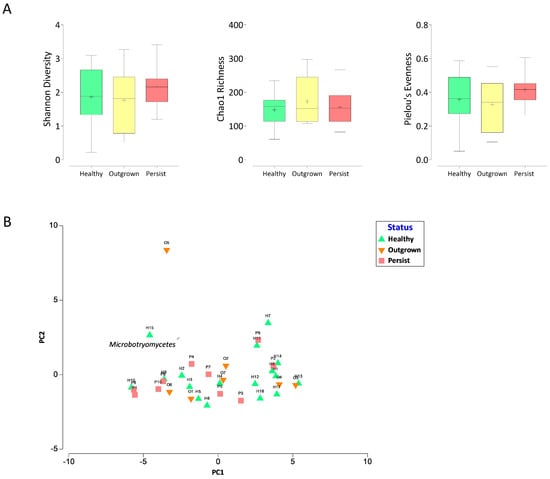 Gut mycobiome alpha diversity (A) and beta diversity (B) in healthy and atopic dermatitis infants. The alpha diversity is depicted as box and whisker plots; the horizontal line represents the median value, while the ‘+’ represents the mean value. Beta diversity is depicted by a Principal Component Analysis (PCA) plot generated based on the relative abundance percentage of fungi at the taxonomic class level. Bi-plot analysis was used to plot significantly different abundant taxa (p-value 0.05). There was no statistically significant difference between the three groups (p > 0.05).