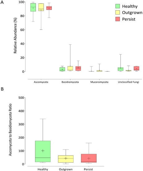 The most prevalent phyla identified in all groups were Ascomycota and Basidiomycota. Notably, the ratio of Ascomycota to Basidiomycota in the persisted group was lower than in the healthy and outgrown groups. Previous research reported that patients with fever retinitis, colon cancer, or inflammatory bowel had a ratio of Ascomycota to Basidiomycota lower than healthy humans [,,]. However, no clear mechanism defining the cause of this occurrence has been discovered.