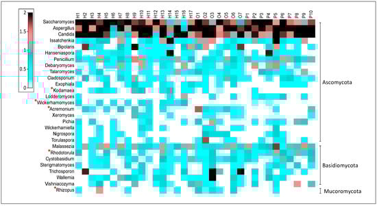 The relative abundance of fungal genera and prevalent compromising the gut mycobiome of healthy and atopic dermatitis infants. The heat map portraying the relative abundance (root four value) of each taxon per infant (H—healthy, O—outgrown, P—persisted). The genera marked with a red asterisk differed significantly between the three groups (p-value 0.05).