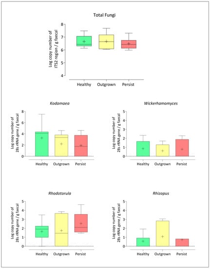 Quantification of each genus was also in agreement with NGS results (Figure 4). The numbers of fungi in all samples were similar. Concentrations of Kodamaea and Wickerhamomyces were highest in the healthy group (4.38 ± 1.11 and 0.86 ± 1.22 log copy number of 28s rRNA gene, respectively), while Rhizopus was highest in the outgrown group (1 ± 1.31 log copy number of 28s rRNA gene), and Rhodotorula was highest in the persisted group (2.5 ± 1.15 log copy number of 28s rRNA gene). Overall, a detection limit as low as 0.9–3.2 log copy number of 26s rRNA gene per gram stool was achieved.