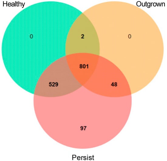 Thirty-four infants (healthy n = 17, outgrown n = 7, and persisted n = 10) were included in the study. Statistical analyses of clinical data showed no significant differences (p > 0.05) between each parameter that might interfere with data observation (Table 2).