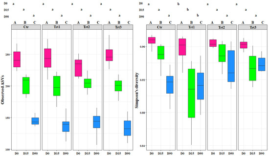 Boxplots of the fungal richness (observed ASVs) and fungal diversity (Simpson’s diversity) at different sampling times (D0: after 12 h; D15: after 15 days; D90: after 90 days). Ctr: bulk soil; Trt1: soil with 10 g of beech wood pellets; Trt2: soil with Trichoderma atroviride SC1 conidial suspension at the rate of 5 × 103 conidia∙g−1 of soil; Trt3: soil with 10 g of T. atroviride SC1 coated beech pellets (5 × 105 conidia∙g−1 of beech wood pellets). Letters indicate significant differences according to the emmeans package (α = 0.05) between treatments at each sampling point (lower case letters) or for the same treatment over time (upper case letters). Data of the two experiments E1 and E2 were pooled.