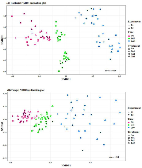 Ordination plots of non-metric multidimensional scale analysis (NMDS) using the Bray-Curtis dissimilarities of bacterial (A) and fungal (B) communities. Pink, green, and blue colors indicate different sampling times (D0: after 12 h; D15: after 15 days; D90: after 90 days) and show how both fungal and bacterial communities are grouped by time. The colors of the filling, grey and black, represent the two experiments (E1 and E2, respectively), and different shapes represent the treatments that grouped, mainly the bacterial community. Ctr: bulk soil; Trt1: soil with 10 g of beech wood pellets; Trt2: Trichoderma atroviride SC1 applied to the soil as a conidial suspension at the rate of 5 × 103 conidia g−1 of soil; Trt3: soil with 10 g of T. atroviride SC1 coated beech wood pellets at 5 × 105 conidia g−1.