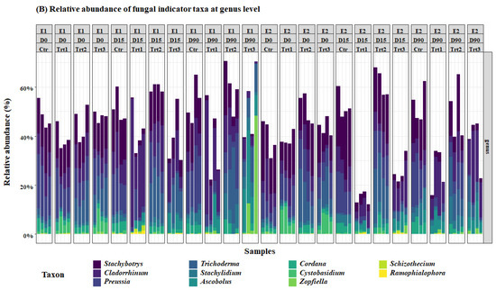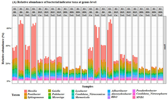 Bacterial and fungal indicator ASVs that have significantly different abundances (p < 0.05) in the factor time and treatment were extracted from the mGLM results. The results of the Simpson’s bacterial diversity index correspond with an increase in the population of the genus Massilia, which was significantly different between the two groups Ctr/Trt2 and Trt1/Trt3 (Figure 5). The results also revealed a significant increase in terms of the relative abundances of the genera Pontibacter, Sphingomonas, Gaiella, Pedobacter, and Microvirga (Figure 5).