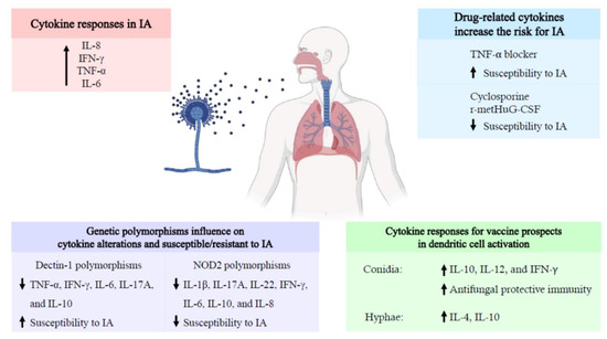 Schematic representation of the cytokine responses associated with invasive aspergillosis in hematopoietic stem cell transplantation. Cytokine responses related to invasive aspergillosis associated with an increase the risk of the disease. Both drugs and genetic polymorphism influence the cytokine expression profile during hematopoietic stem cell transplantation. In addition, different activation patterns of Aspergillus morphotypes lead to different cytokine expression profiles. Abbreviations: IA, invasive aspergillosis; IFN, interferon; IL, interleukin; NOD2, nucleotide oligomerization domain 2; r-metHuG-CSF, recombinant human granulocyte colony stimulating factor; TNF, tumor necrosis factor. The black arrows indicate the increase or decrease in cytokines and chemokines.