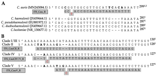 Allele-specific primer binding sites in the ITS region for the identification of C. auris (A) and C. auris clades (B). Specific polymorph nucleotides are shown in bold, primers are shown in gray, and mismatches contained within the primer are shown in red. 1 Nucleotide position from ITS1 forward primer. 2 Length based on ITS region of clade I.