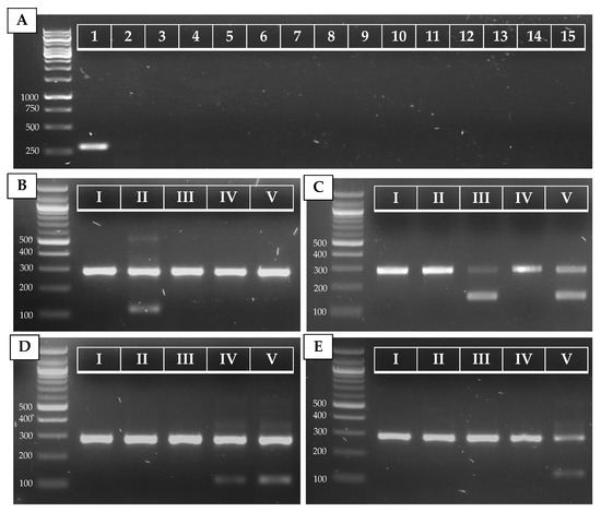 PCR results for C. auris (A) and C. auris clade (B–E) identification. (A) Simplex PCR of the ITS1–ITS_CauR primer pair at 78 °C Ta on 20 ng of purified DNA of C. auris (1), C. haemulonii (2), C. duobushaemulonii (3), C. pseudohaemulonii (4), C. albicans (5), C. tropicalis (6), C. parapsilosis (7), C. glabrata (8), C. lusitaniae (9), C. orthopsilosis (10), C. metapsilosis (11), C. sake (12), C. dubliniensis (13), C. krusei (14), and S. cerevisiae (15). (B–E) Duplex PCR of the ITS1–ITS_Cau_R and ITS1–ITS_CauCII_R (B), RHA1_CauCIII/V_F–RHA1_CauCIII/V_R (C), ITS1–ITS_CauCIV/V_R (D), and ITS1–ITS_CauCV_R (E) primer pairs at 68 °C Ta on 20 ng of purified DNA of C. auris B8441 (I), B11220 (II), B11221 (III), B11244 (IV), and B18474 (V), which are reference strains from clades I to V, respectively.