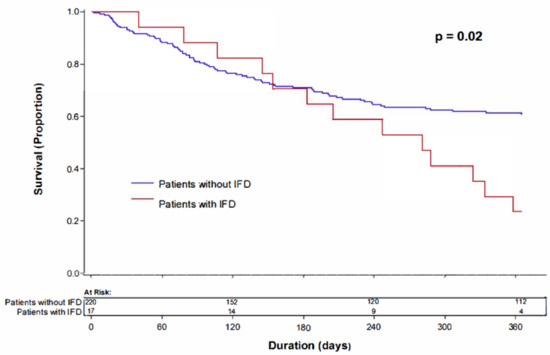 Overall mortality in our cohort of 251 patients was 37% (n = 92) within the first year after receiving first induction chemotherapy for the treatment of AML. The mortality rate in patients who had relapsed/refractory AML was 70% (n = 77) compared with 12% (n = 15) in those without relapse, p < 0.001. Kaplan-Meier survival analysis showed significantly higher mortality at 1 year from first induction in patients who developed proven or probable IFD (13/17, 76%) when compared with those who did not develop IFD (79/220, 36%) (log-rank test, p = 0.02) (Figure 1).