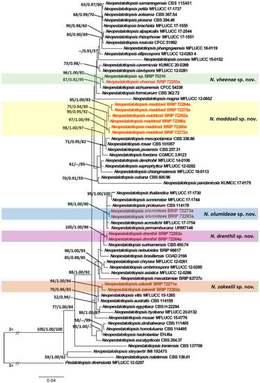 - Maharachchikumbura, S.S.N.; Guo, L.D.; Cai, L.; Chukeatirote, E.; Wu, W.P.; Sun, X.; Hyde, K.D. A multi-locus backbone tree for Pestalotiopsis, with a polyphasic characterization of 14 new species. Fungal Divers. 2012, 56, 95–129. [Google Scholar] [CrossRef] [Green Version]