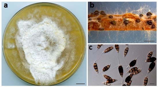 - Crous, P.W.; Wingfield, M.J.; Chooi, Y.H.; Gilchrist, C.L.M.; Lacey, E.; Pitt, J.I.; Roets, F.; Swart, W.J.; Cano-Lira, J.F.; Valenzuela-Lopez, N.; et al. Fungal Planet description sheets: 1042–1111. Persoonia 2020, 44, 301–459. [Google Scholar] [CrossRef] [PubMed]