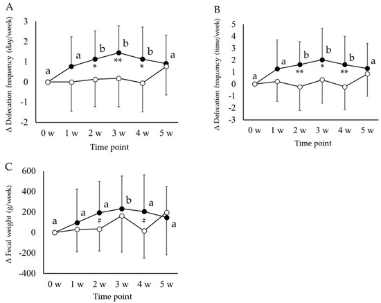 Comparison of the changes (Δ) in weekly defecation frequencies ((A) days per week and (B) times per week) and fecal weight ((C) g per week) from baseline values (0 w) in the koji amazake group (filled circle) and placebo group (empty circle). Each value is expressed as mean ± standard deviation. Inter-group comparisons between the koji amazake and placebo groups were performed using repeated measures analysis of variance (ANOVA) followed by a paired t-test; significant differences are indicated by ** p < 0.01, * p < 0.05, and # p < 0.1. a, b Intra-group changes from baseline values (0 w) in each group at six time points were compared using Dunnett’s multiple comparisons test; values with different superscript letters in each profile indicate significant difference (p < 0.05).