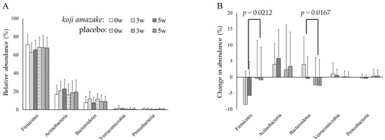 A total of 4,879,397 filtered high-quality sequence reads were generated, including the following (results are presented as time point, total reads of 44 samples, average ± SD per sample, max, and min): 0 w, 672,457, 15,283 ± 3890, 24,479, 10,338; 3 w, 2034.436, 46,237 ± 9.036, 77,124, 31,283; 5 w, 2,172,504, 49,375 ± 6759, 74,864, 34,688. Eight bacterial phyla were identified (Table S2). The dominant phyla were Firmicutes, Actinobacteria, Bacteroidetes, Verrucomicrobia, and Proteobacteria, and members of these five phyla constituted an average of 97.8% (range 97.3–97.8%) in both groups. As shown in Figure 2A, statistical analysis of the relative abundance of each phylum revealed no significant differences in the inter-group and intra-group comparisons. The Firmicutes-to-Bacteroidetes ratios of koji amazake and the placebo group were 26.7 ± 33.4 and 7.5 ± 4.0 at 0 w, 15.8 ± 28.3 and 32.5 ± 83.2 at 3 w, and 20.7 ± 30.7 and 48.1 ± 170.3 at 5 w, respectively. The difference of mean values with large standard deviations showed the ratios of participants in both two groups were spread out over a large range even at 0 w, and there was no inter- and intra-group significant difference. However, analysis of the inter-group comparison of the changes (Δ) in relative abundance from baseline (0 w) to 3 and 5 w showed significant differences in ΔFirmicutes (relative abundance) (−8.51% vs. −0.43%, p = 0.0212) and ΔBacteroidetes (3.56% vs. 2.44%, p = 0.0167) at 3 w. Furthermore, the ΔFirmicutes value decreased significantly from baseline (0 w) to 3 w (p = 0.0033) in the intra-group comparison of the koji amazake group (Figure 2B).