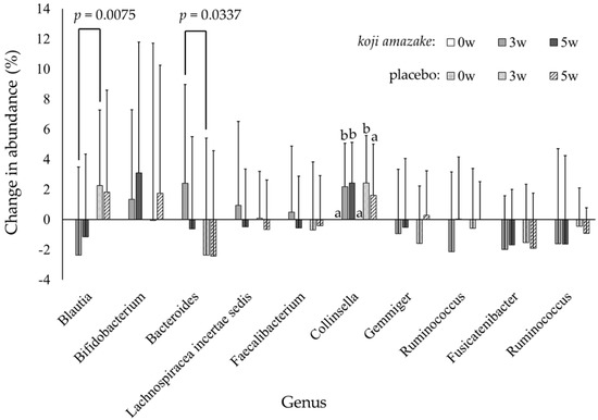 Inter− and intra−group comparison of the changes in Δ relative abundance from baseline values (0 w) to 3 w and in each of ten dominant bacterial genera of the koji amazake and placebo groups. Each value is expressed as mean ± standard deviation. Delta (Δ) relative abundance is the change in relative abundance compared with the value at baseline. Statistical analyses: p values indicate significant inter−group difference, analyzed using repeated measures ANOVA (Blautia: group p = 0.0193, time p = 0.8846, group × time p = 0.0276; Bacteroidetes: group p = 0.0830, time p = 0.2191, group × time p = 0.0617) followed by a t-test. a, b Columns with different letters indicate significant difference (p < 0.05), with intra-group comparison in each group of each genus at three time points, as calculated using Dunnett’s multiple comparisons test.