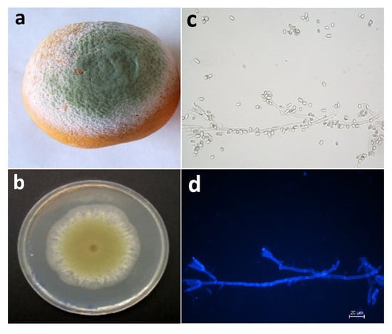 Green mold decay in orange fruit infected with Penicillium digitatum. (a) Orange fruit with green mold symptoms caused by P. digitatum; (b) typical aspect P. digitatum growing on PDA plates; (c) P. digitatum conidiphore with conidia borne terminally in chains observed by bright-field optical microscopy; (d) P. digitatum with fluorescence after staining with CFW.
