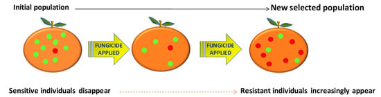 Like in all organisms, there is genetic variation in pathogenic fungal populations. This variation provides the starting point from which fungicide resistance progresses. A complete population of resistant pathogenic fungi develops owing to natural selection, in which the environment favors the reproduction and proliferation of resistant forms. Individual fungicide applications can be considered the “selection events” that promote this process, selectively killing susceptible fungi. However, any resistant mutant will survive these events and subsequently have the opportunity to grow and reproduce without competition from susceptible fungi. After one application, this increasingly resistant population can proliferate and reproduce [] (Figure 2).