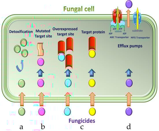 Resistance to fungicides might be due to various procedures [,,,], including (a) reduced fungicide binding due to alteration of the target site, (b) overexpression of the target protein, (c) reduced fungicide absorption due to efflux pump removing toxic compounds, and (d) metabolic degradation of the fungicide through detoxification (Figure 3).