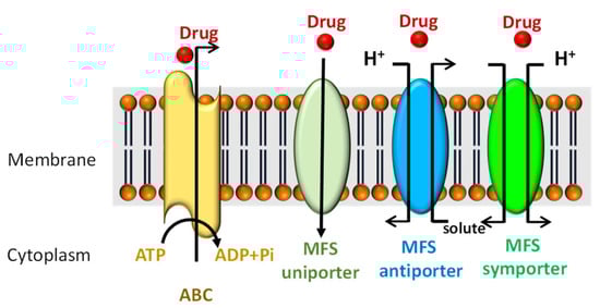 MFS transporters are part of the family of active secondary transporters that can transport substances in response to ionic gradients. MFS transporters can mediate antiport, uniport, and symport of different products [] (Figure 4). MFS transporters can serve as drug transporters owing to a proton gradient, which allows it to confer multidrug resistance (MDR). Many of these MFS transporters transport small molecules in response to ionic gradients in such a way that they function as an H + antiporter in microorganisms, regulating their growth under stress conditions as they affect the membrane potential and internal pH [].