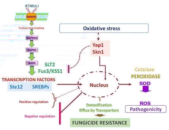 Figure 5 illustrates how transcriptional regulation plays an important role in fungal interactions and how signal transduction pathways can be interconnected. Furthermore, oxidative stress and the ROS response may also be part of fungal–plant interaction as they are simultaneously involved in fungal pathogenicity and resistance to fungicides.