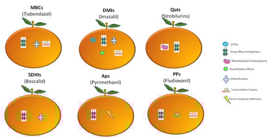 Mechanisms of resistance to main types of fungicides used for green mold disease management. Each orange represents a chemical class, whereas the cryptograms within the oranges correspond to a resistance process as shown in the figure. MBCs: methyl benzimidazole carbamates, DMIs: demethylation inhibitors; QoIs: quinone outside inhibitors; SDHIs: succinate dehydrogenase inhibitors; APs: anilinopyrimidines; PPs: phenylpyrroles. Adapted from Hu and Chen [].