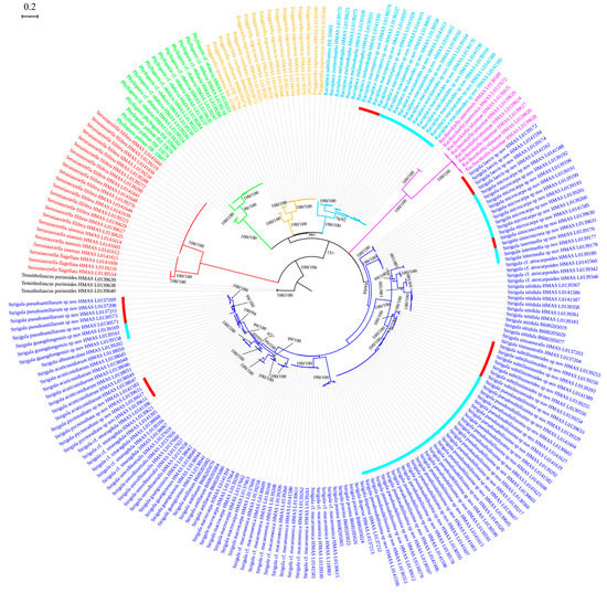 Phylogenetic trees were drawn using FigTree v. 1.4.2 [65]. All new sequences generated in this study were deposited in GenBank and the alignments in TreeBASE (http://purl.org/phylo/treebase/phylows/study/TB2:S27476 (accessed on 12 October 2021)).
