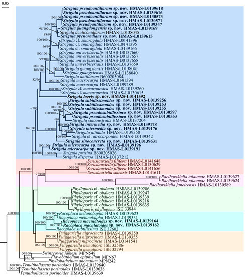 The four-marker tree included data for one of the two new species in Racoplaca (R. maculatoides), and also resolved all nine new species in Strigula s.str. separately delimited based on the ITS tree (S. guangdongensis, S. intermedia, S. laevis, S. microcarpa, S. pseudoantillarum, S. pseudosubtilissima, S. pycnoradians, S. sinoconcreta, and S. subtilissimoides).