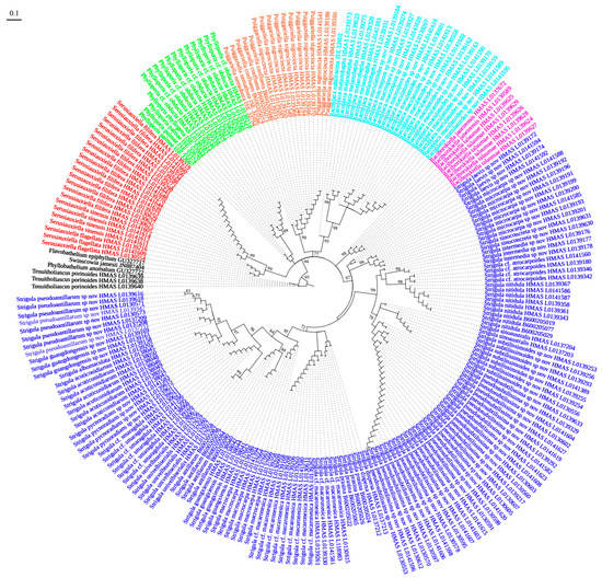 Publicly available datasets were analysed in this study. All resulting alignments were deposited in TreeBASE (http://www.treebase.org (accessed on 12 October 2021); accession number S27476). All newly generated sequences were deposited in GenBank (https://www.ncbi.nlm.nih.gov/genbank/ (accessed on 12 October 2021); Table S1). All new taxa were deposited in MycoBank (https://www.mycobank.org/ (accessed on 12 October 2021)).