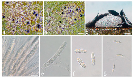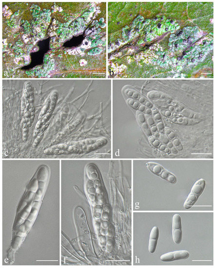- Hyde, K.D.; Jones, E.B.G.; Liu, J.K.; Ariyawansa, H.; Boehm, E.; Boonmee, S.; Braun, U.; Chomnunti, P.; Crous, P.W.; Dai, D.Q.; et al. Families of Dothideomycetes. Fungal Divers. 2013, 63, 1–313. [Google Scholar] [CrossRef]