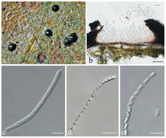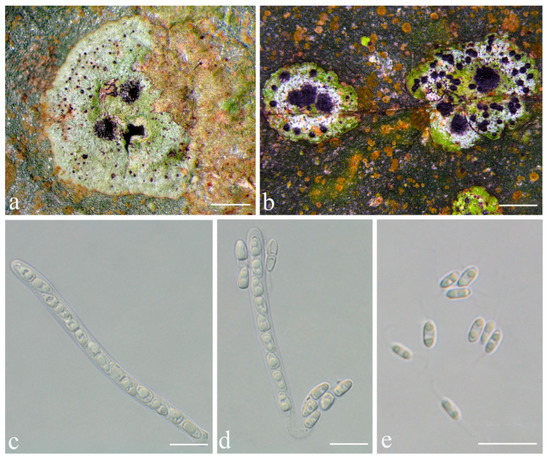Strigula intermedia sp. nov. (holotype, HMAS–L0139177). (a) Thallus; (b,c) asci and ascospores; (d) ascospores; (e) macroconidia. Scale bars: (a) = 300 μm, (b–e) = 10 μm.