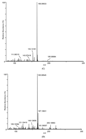 In Figure 2C, ions m/z 165 and 153 dominate in the sampled headspace for F. verticillioides on cracked maize. Similarly, in Figure 2D, ions m/z 165 and 167 dominate in the sampled headspace for F. scirpi. The m/z 167 peak is not observed at substantial levels in the headspace from other fungi. The distinctive m/z 167 peak (167.10631) is readily resolved from the isotopic peak expected to result (167.10225) from two 13C atoms being incorporated into the molecule responsible for the large m/z 165 (165.09545) peak (data not shown). Higher levels of the m/z 165 peak are observed in the headspace from F. graminearum, F. verticillioides, and F. scirpi.
