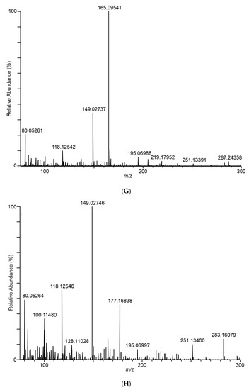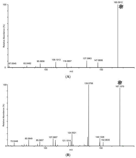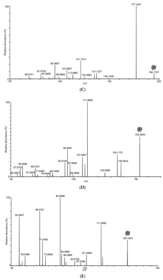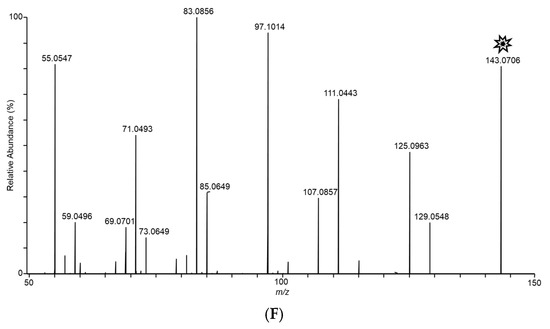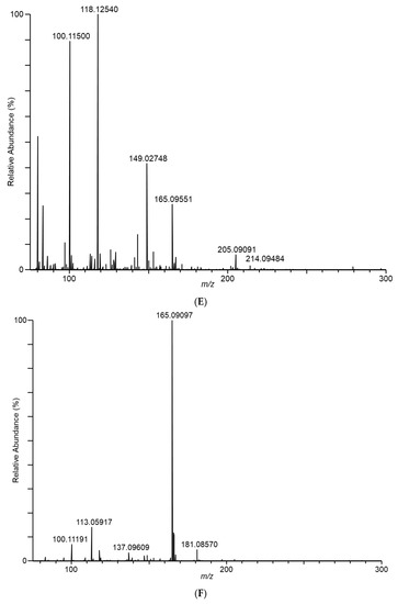 Tandem CID spectra for m/z (A) 165 (from F. scirpi), (B) 167 (from F. scirpi), (C) 195 (from F. verticillioides), (D) 153 (from F. verticillioides), (E) 129 (from F. graminearum), and (F) 143 (from F. graminearum) ions. [M + H]+ target ions for the CID experiments are labelled with a “