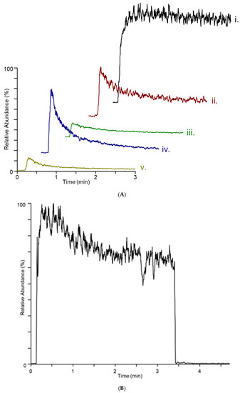 Plots of extracted ion intensity versus time for (A) m/z 165 from (i.) F. verticillioides, (ii.) F. virguliforme, (iii.) F. graminearum (iv.) F. scirpi, and (v.) F. avenaceum and (B) m/z 195 from F. verticillioides on cracked maize. The full scale for count intensity for plot (A) is 1.26 × 107 and for plot (B) is 1.88 × 105.