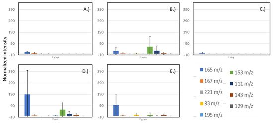 Intensities of selected ions from week 2 of sampling from cultures of (A) F. scirpi, (B) F. avenaceum, (C) F. virguliforme, (D) F. verticillioides, and (E) F. graminearum. Intensities are normalized relative to the diagnostic ion for cracked maize (m/z 86). Intensities shown are averages of measurements conducted, and error bars indicate calculated standard deviations for the six measurements.