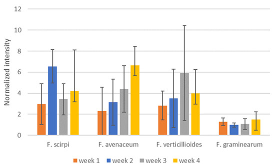 Intensities of selected, potentially diagnostic, ions from weeks 1–4 of sampling for F scirpi (m/z 167), F. avenaceum (m/z 83), F. verticillioides (m/z 195) and F. graminearum (m/z 129) isolates. Intensities are normalized relative to the diagnostic ion for cracked maize (m/z 86). Intensities shown are averages of measurements conducted from culture bottles and error bars indicate calculated standard deviations for the measurements.