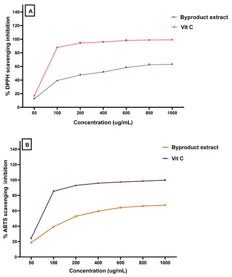 The antioxidant activity of mandarin byproduct using (A) DPPH assay, and (B) ABTS assay.
