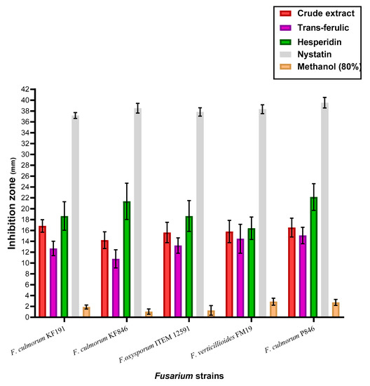 To determine the more effective application of phenolic compounds as individual applications and in their crude extract, two compounds (trans-ferulic and hesperidin) were chosen. These compounds were individually added to the fungal growth media at the same concentration that was determined in the crude extract. Briefly, five groups were designed for each fungal strain crude extract treatment, trans-ferulic treatment, hesperidin treatment, the control, and Nystatin (EIPICO chemical, Co., 10th of Ramadan City, Cairo, Egypt) as a standard antifungal [14]. The treatment materials were applied in the growth media of the five Fusarium strains identified in Section 2.1 of this study. The impacts were recorded as an inhibition zone (mm) using the agar diffusion assay as described before [16].