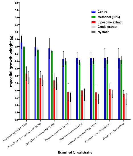 The minimal fungicidal concentration was determined for extracts forms (liposomal and crude extract) using the methodology described by Badr et al. [31]. The antifungal potency of liposomal and non-liposomal materials was determined using the same methodology described before [32]. The fungal strains’ spore suspension (1.2 × 105 spore/mL) of each was inoculated into conical flasks containing potato dextrose broth. Flasks, which were utilized for each fungal growth, are classified into three groups regarding the treatments (control, crude extract, and liposome). The results were described as the more mycelia weight reduction by the treatment the more antifungal potency material, where the reduction expressed including percentile ratio using the equation recommended by Badr et al. [21]: