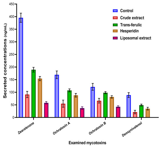 The impact of crude byproduct extract, liposomal extract, and the two standard materials of phenolic compounds (trans-ferulic and hesperidin) was determined in the applied fungal growth media (Figure 4). The results reflected the efficacy of liposomal extract followed by the crude extract to reduce the secreted concentrations of mycotoxins. It was clear that the impacts of applied extracts (crude and liposomal extract) were recorded by more reduction to the ZEA concentrations followed by the DON concentrations. Nonetheless, the implementation of the fungal growth media of trans-ferulic and hesperidin was reflected as a valuable reduction in mycotoxin concentrations, but the reduction ratio was still less than the extract itself.