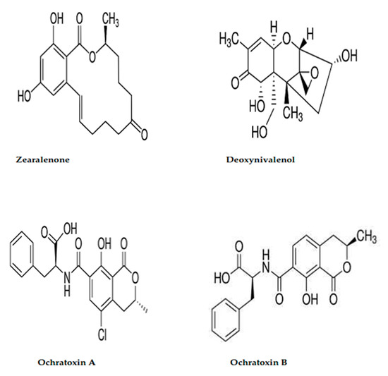 Chemical structure for ochratoxins (A,B), deoxynivalenol, and zearalenone.