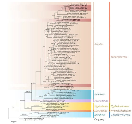 In their geographical distribution and ecological preferences, the members of Xylodon are widespread and primarily wood decomposers, causing a white-rot of woody substrates, which are widely distributed in various forest ecosystems from boreal, temperate, subtropical, to tropical zones [16,55]. Some taxa of Xylodon have been collected on rotten trunks and stumps of conifers and angiosperms, bamboo, and ferns [3,12,32,34,44,56,57,58,59,60,61,62,63,64,65,66,67,68,69,70,71,72].