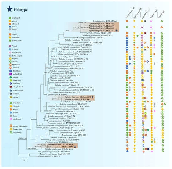 Miettinen et al. [71] analyzed a higher-level phylogenetic classification of polypores and showed that the macromorphology of fruiting bodies and hymenophore construction did not reflect monophyletic groups. The current phylogeny shows that the morphological characters do not follow the phylogenetic group on different taxa in this genus. However, several characters lead the key role, e.g., the hyphal system monomitic, basidiospores ellipsoid, and thin-walled (Figure 2).