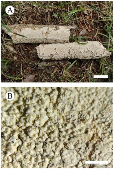 Basidiomata of Xylodon montanus (holotype): the front of the basidiomata (A), character hymenophore (B). Bars: (A) = 2 cm and (B) = 0.5 mm.