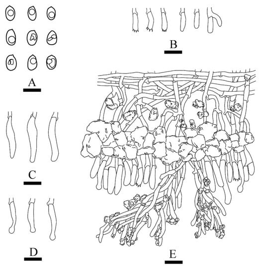 Microscopic structures of Xylodon laceratus (holotype): basidiospores (A), basidia and basidioles (B), fusiform cystidia (C), capitate cystidia (D), A section of hymenium (E). Bars: (A) = 5 μm, (B)–(E) = 10 µm.