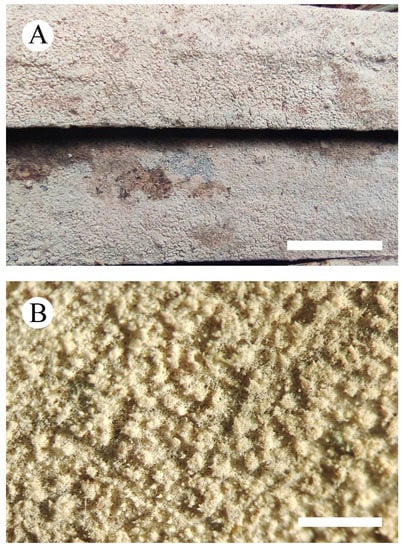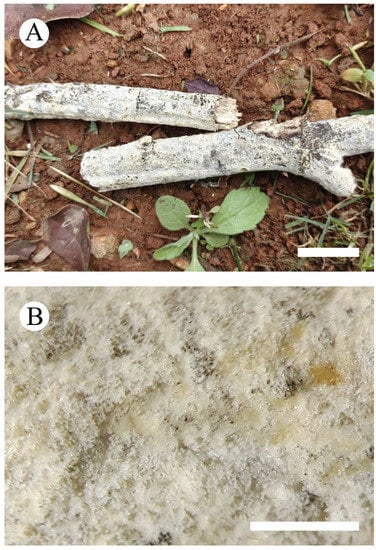 Basidiomata of Xylodon tropicus (holotype): the front of the basidiomata (A), character hymenophore (B). Bars: (A) = 1 cm and (B) = 1 mm.