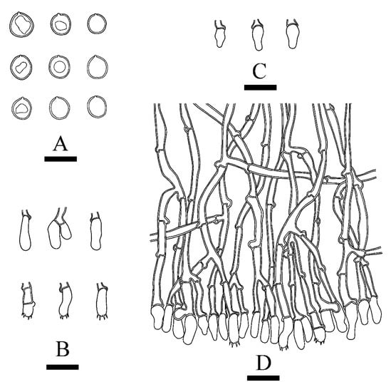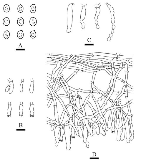 Microscopic structures of Xylodon tropicus (holotype): basidiospores (A), basidia and basidioles (B), and fusiform cystidioles (C), A section of hymenium (D). Bars: (A) = 5 μm, (B–D) = 10 µm.