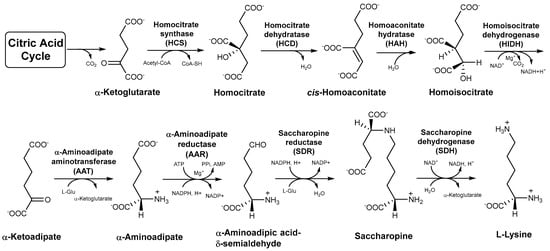 - Xu, H.; Andi, B.; Qian, J.; West, A.H.; Cook, P.F. The α-aminoadipate pathway for lysine biosynthesis in fungi. Cell Biochem. Biophys. 2006, 46, 43–64. [Google Scholar] [CrossRef]